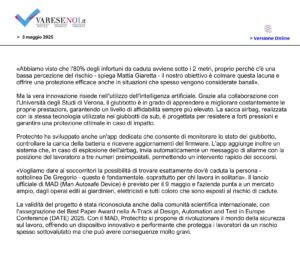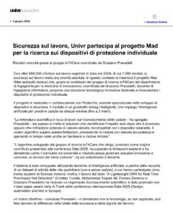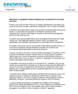 MAD è un dispositivo all’avanguardia che grazie a un avanzato sistema elettronico, monitora costantemente la stabilità di chi lo indossa e, in caso di caduta, si gonfia in soli 0,25 secondi, proteggendo il lavoratore dalle conseguenze derivanti dall’impatto. Il sistema è inoltre dotato di un’app che invia automaticamente un segnale di emergenza con la geolocalizzazione dell’infortunato, garantendo un intervento rapido dei soccorsi.