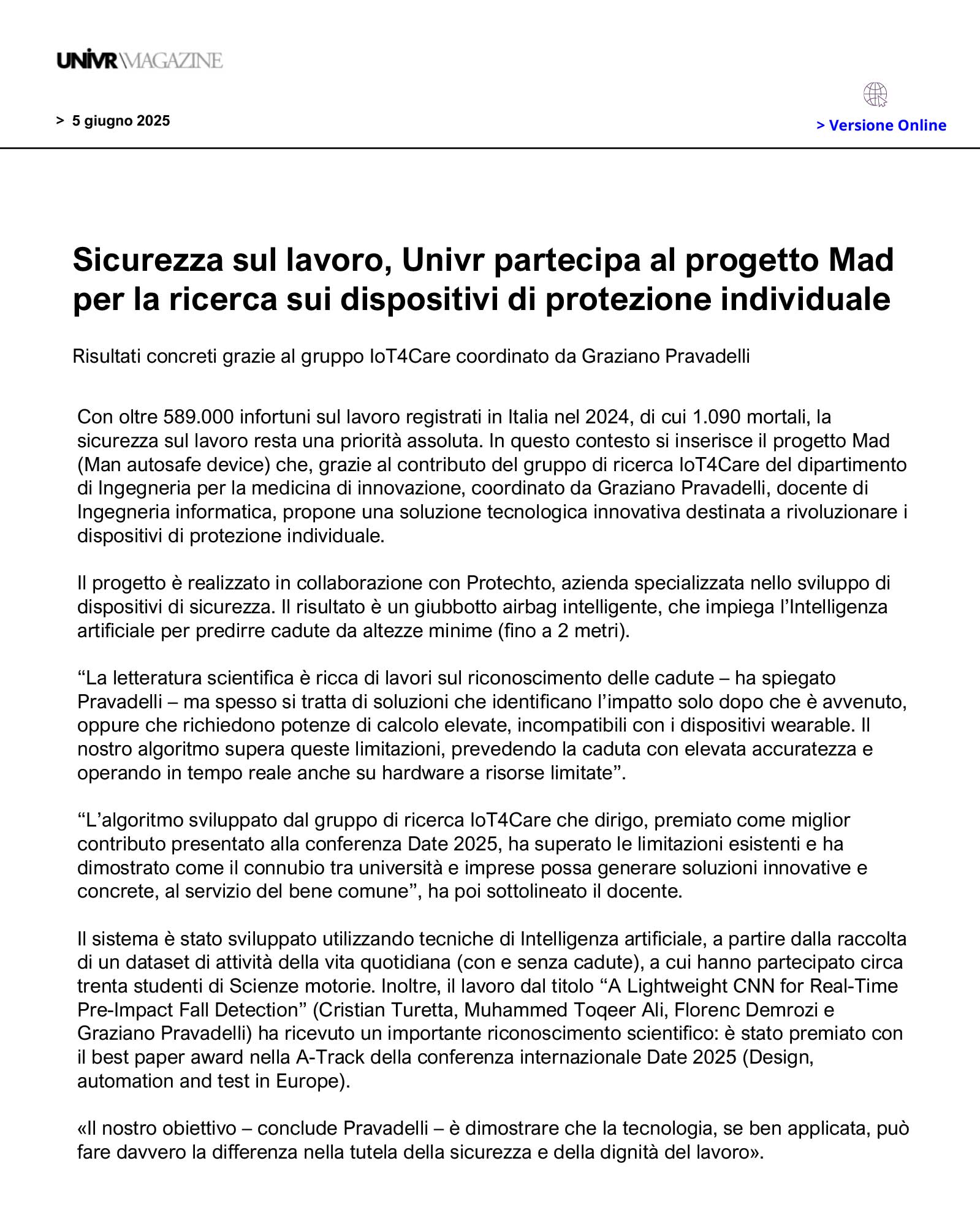 MAD è un dispositivo all’avanguardia che grazie a un avanzato sistema elettronico, monitora costantemente la stabilità di chi lo indossa e, in caso di caduta, si gonfia in soli 0,25 secondi, proteggendo il lavoratore dalle conseguenze derivanti dall’impatto. Il sistema è inoltre dotato di un’app che invia automaticamente un segnale di emergenza con la geolocalizzazione dell’infortunato, garantendo un intervento rapido dei soccorsi.